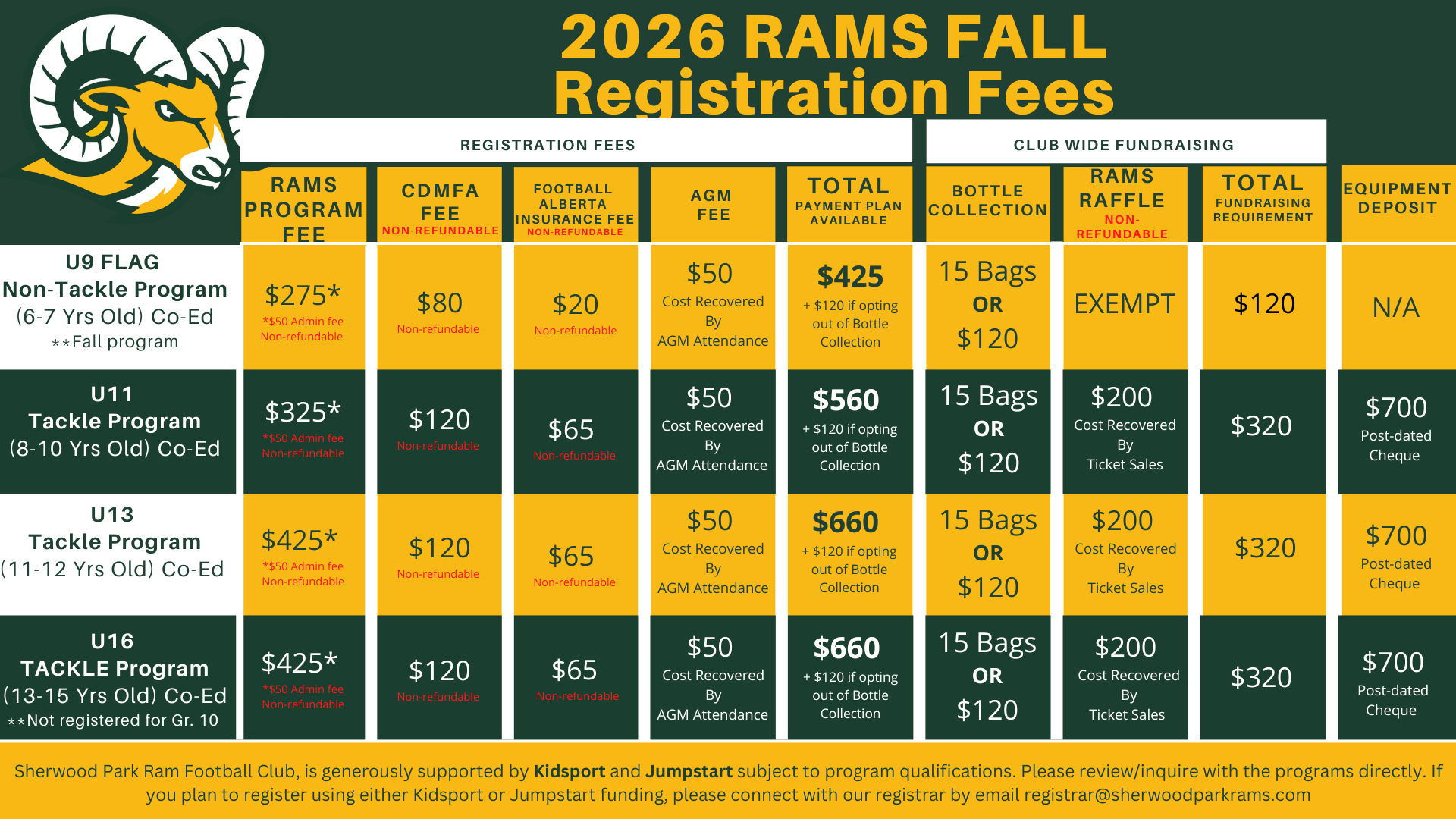 **Sherwood Park Ram Football Club, is generously supported by Kidsport and Jumpstart ** subject to program qualifications. Please see Links below to review/inquire with the programs directly. If you plan to register using either Kidsport or Jumpstart funding, please connect with our registrar by email registrar@sherwoodparkrams.com
